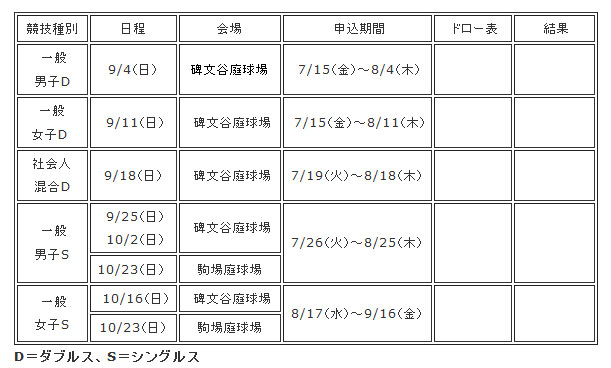 テニス目黒区民大会の日程が発表されました。男子ダブルス、女子ダブルス、ミックスダブルスの申し込みが始まっています。男子ダブルスは9/4(日)から開催で、申し込み締め切りが8/4(木)までですのでお早目にどうぞ。